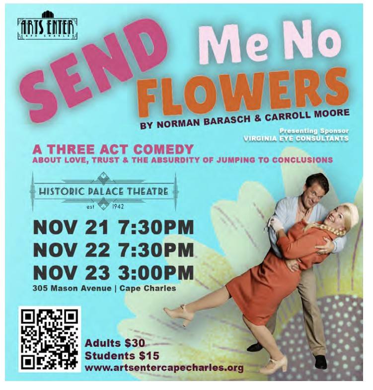 CAPE CHARLES, VA – Arts Enter Cape Charles will present the beloved three-act comedy “Send Me No Flowers” by Norman Barasch and Carroll Moore at the Historic Palace Theatre for three performances November 21-23.