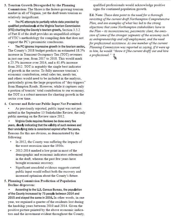 The writer was referring to an article by Andrew Follmer that appeared in this month’s Citizens for a Better Eastern Shore’s Shoreline Newsletter. We agree that The Cape Charles Mirror dropped the ball on this issue. We are reprinting Mr. Follmer’s analysis of the current Northampton County Draft Comprehensive Plan, with permission from CBES: