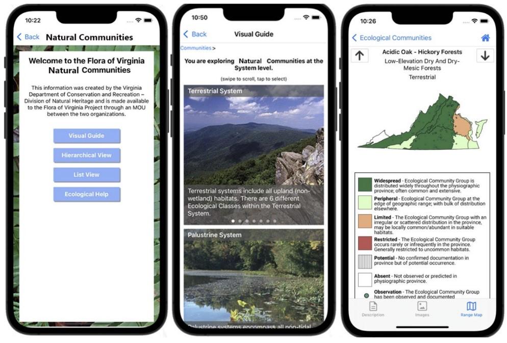 September 1, 2023 — Richmond, Va. — The Foundation of the Flora of Virginia Project (the Flora) announced today the launch of a new guide to the Natural Communities of Virginia in the Flora of the Virginia smartphone App. The classification system developed by Vegetation Ecologists with the Virginia Department of Conservation and Recreation’s Natural Heritage Program (Natural Heritage), provides a framework to describe natural communities.