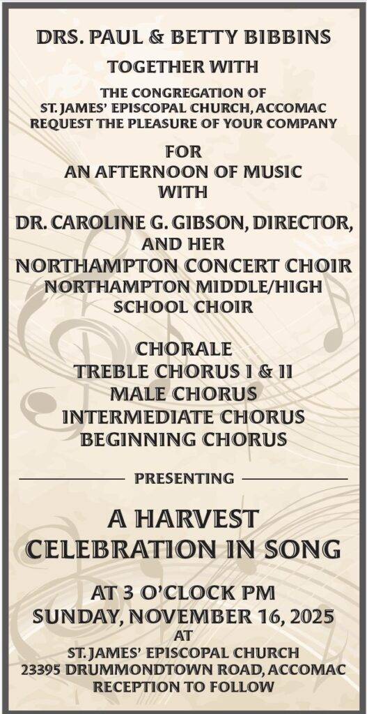 ACCOMAC — Drs. Paul and Betty Bibbins, together with the congregation of St. James’ Episcopal Church in Accomac, will host an afternoon of music on Sunday, November 16, 2025, featuring the talented student vocal ensembles of Northampton County.