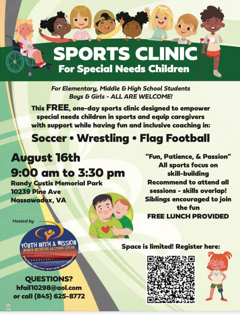 NASSAWADOX, Va. — A free one-day sports clinic for children with special needs will be held Friday, Aug. 16, at Randy Custis Memorial Park in Nassawadox.