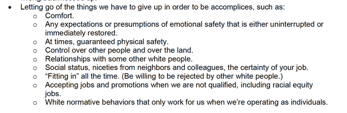 6. I would love to know to name of these trainers. I need them to come and teach me why my mother picked cotton and my Irish ancestors were slaves and I had a 10000 unmet need and was unable to finish college and had to take crappy jobs. Everything I worked for I earned just like a professional basketball player or black professional business man. Racism is when you focus on the color stop focusing on the color. If they had never gotten to America however they did they would not have the opportunities that they have today. I appreciate my Irish ancestor slaves for what they did for me to be free. The freedom of the USA is based on the blood of our American soldiers which is why we are all here today. Appreciate the history of our country and where we came from and where we are today. I will never be repaid for the treatment of my ancestors and my mom. I can only make myself a better person for today. That is white person because I’m white. I will never be ashamed of who I am or where I came from and I would love to meet these teachers that think they can make me ashamed of my color. I am no more ashamed of my color than any other person is. My color has not afforded me any extra opportunities. If anything it has kept me from getting jobs.