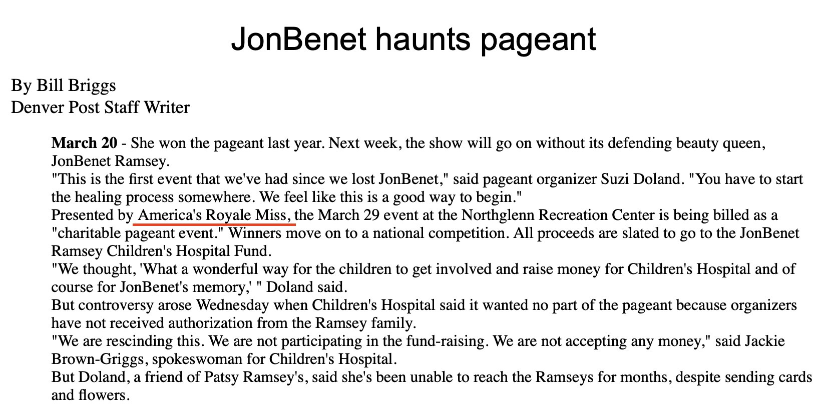 “America’s Royale Miss”, another of JonBenet’s supposed pageant victories, is another dead end. The only hint of the existence of JonBenet’s pageant history comes from an article in the Denver Post, “JonBenet Haunts Pageant”: