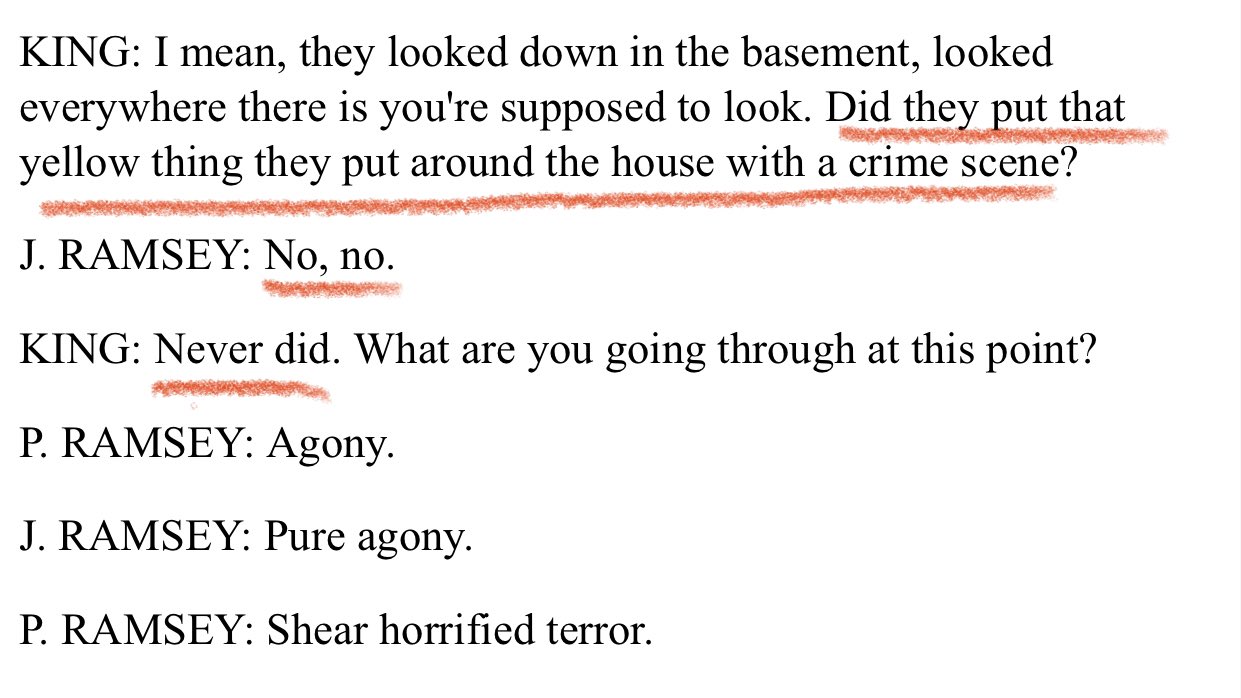 In Larry King Live Interview on CNN where John and Patsy revealed they’d never once seen or requested their daughter’s Death Certificate in the 3 years since JonBenet’s death. They also said there was no yellow crime scene tape around their home.