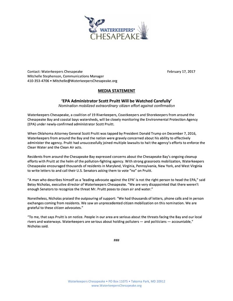 1 thought on “Waterkeepers Chesapeake Respond to Appointment of Scott Pruitt to EPA”