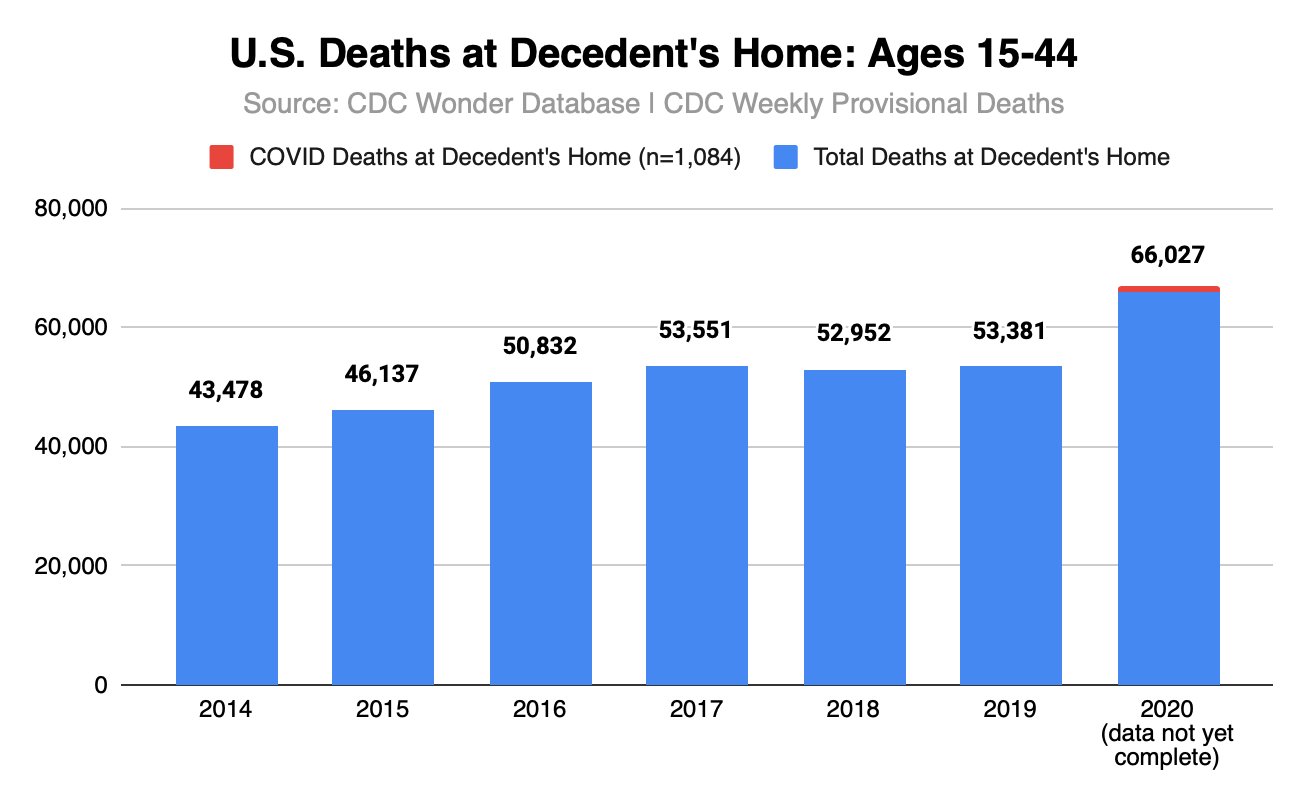 There was a large increase in 2020 for deaths at home among ages 15-44. And it wasn’t COVID.