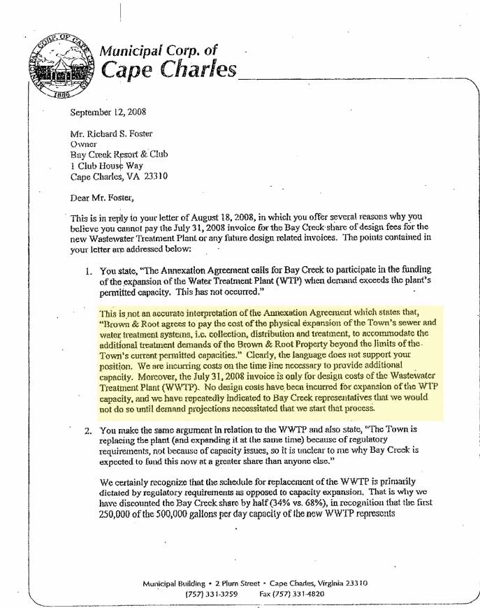 In 2008, with the construction of a new Water and Wastewater Treatment Plant looming, the Town of Cape Charles embarked on a futile quest to obtain from Bay Creek, the current assigns to the Brown and Root Annexation Agreement, payment for their share of new plant, as per the agreement. While there were several months of back and forth between the developer and the Town, in the end, the whole matter was eventually dropped, and the full cost of building the new plant was assigned to the taxpayers.
