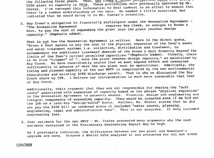 The correspondence below from Assistant Town Manager Bob Panek to Town Council makes it clear that there was a firm belief that that based on the Agreement, Richard Foster and Bay Creek was responsible for the new plant.