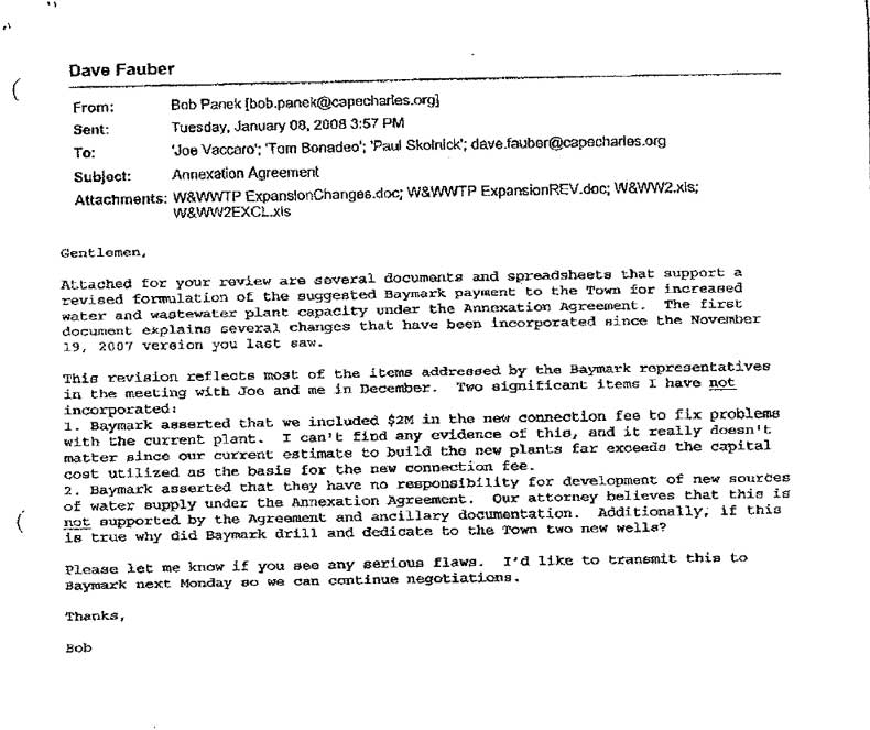 Sources around at that time offer some insights. First, it was noted that while Joe Vacarro was the Town Manager, he was told by Town Council to stay out of the water and waste water issues, that Bob Panek would be handling it. Vacarro was relegated to a mere signatory on correspondence between the Town and Bay Creek. Why would the Town Manager not be privy to these dealings? Anyone that knows Mr. Vacarro would consider this a red flag. Vacarro is nobody’s fool, and he would have quickly picked up on an operation that was not 100% above board, so locking him out of the process appears to have been strategic.