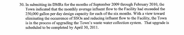 Capacity issues had been a concern for some time. Brown and Root had concerns early on and began building pumping stations as a precaution. Oddly, while the town was working with large buildout estimates, it only built a new plant to the current capacity of the old one–250,000 gallons per day. However, as was stated in a State Water Control Board Enforcement Action in September 2010 (the town was completely out of compliance on many levels, including high levels of Enteroccci), per DMRs submitted to the DEQ, the inflow into the plant exceeded 250k per day for part of 2009 and most of 2010: