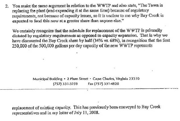 The Town’s deciding to build a plant to the same capacity of the old one was dubious; given estimates, and that the plant was already seeing capacity at 250,000, why would they decide not to expand? It also appeared that, according to legal advice and the reading of the Annexation Agreement, Cape Charles believed that the capacity argument was “patently absurd”: